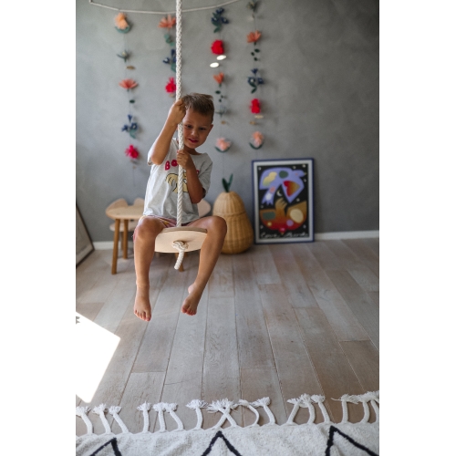 Оваа природна дрвена нишалка со диск може да се лула во секоја насока, да